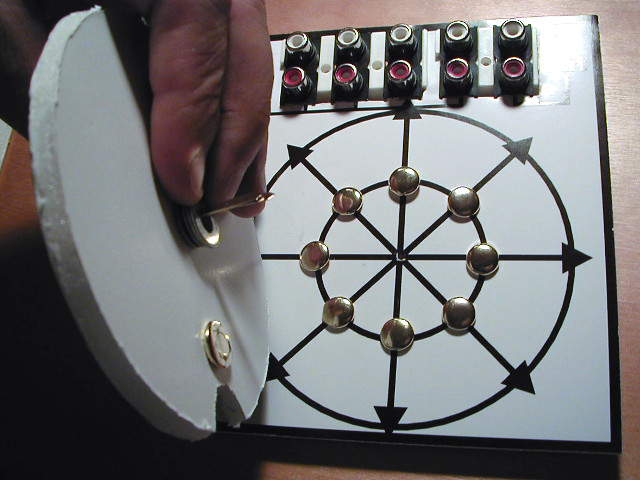 When you spin the top (by placing your finger in the notch), a brass contact on the disc alternately makes and breaks the connection with a ring of 8 contacts on the base. By connecting audio sources through the contacts on the base, and picking up the output through the common contact, you can create an 8 stage sequence.