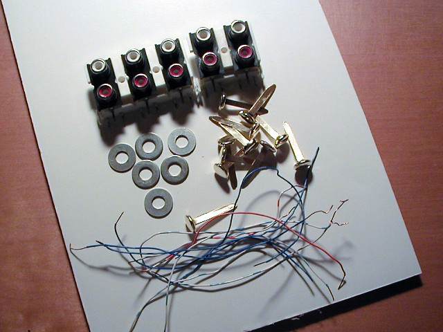 The Cardboard Sequencer is constructed from cardboard, brass split-pins, washers and some hookup wire. You can find split-pins at an office supply store. The phono jacks are optional, but they make it easier to hook devices up to the sequencer.