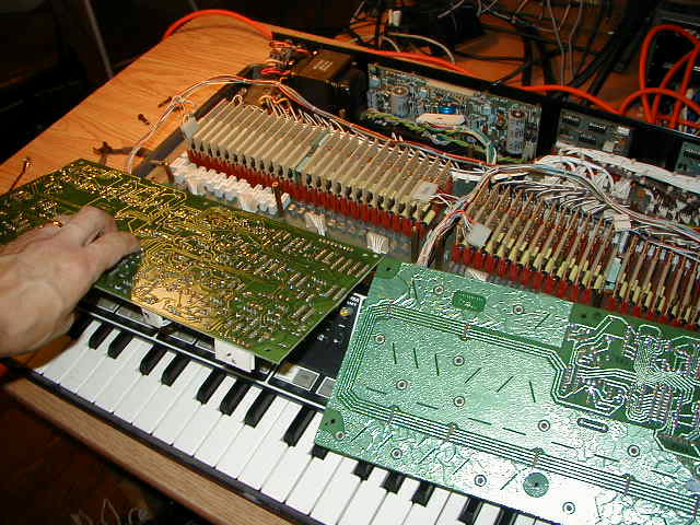 Other than the Polycom chips, there are no custom or hard to find components in the Polymoog. Most of the difficulty in repairing them comes from the complicated design, and multi-board layout. Even tracing simple faults is extremely laborious and time consuming.