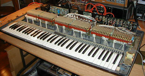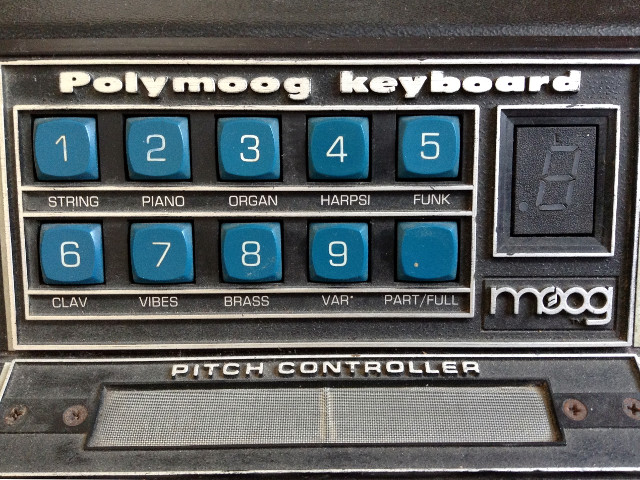 There are two rows of mode switches on the front panel of the Polymoog, labeled String, Piano, Organ, Harpsichord, Funk, Clav, Vibes, and Brass. Pressing one of these buttons will send preset control voltages to the Polycom cards.