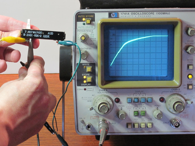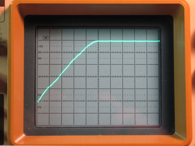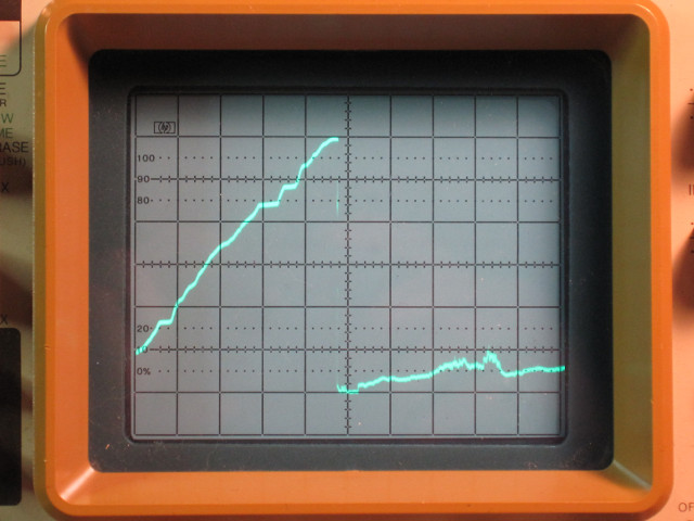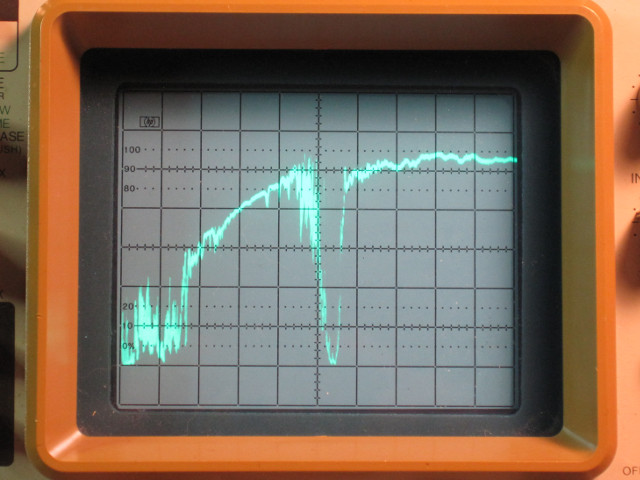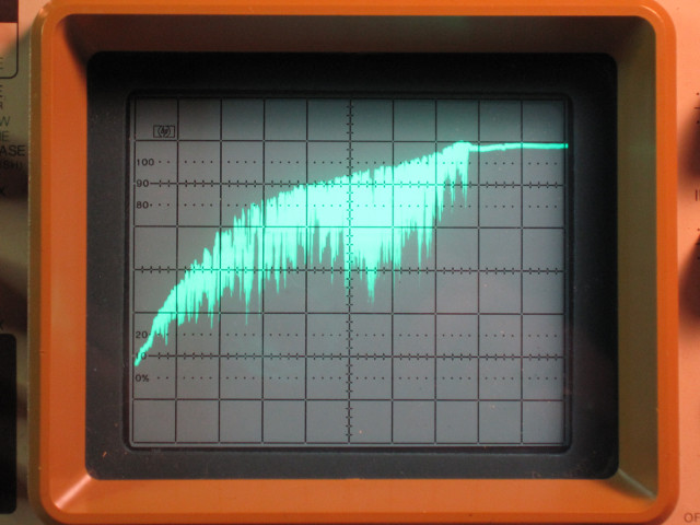 To determine how clean a fader was, I connected a DC power supply across the outer terminals, and probed the centre terminal with an analog storage oscilloscope.