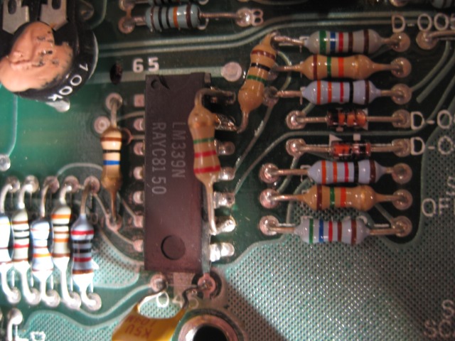 This Prophet-5 was an early Rev-3, so there were extra resistors, capacitors, and jumpers, tacked in all over the place. Shown here are some resistors hand-soldered to a comparator chip. The pink goo on the trimmer in the upper-left is just so that it won't move during transport.