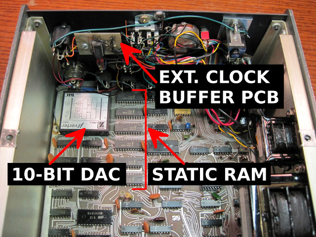In the early models there are 6 static RAM chips, but there are only 5 in the later models. Each chip increases the memory word width by 4 bits. Since the early models recorded 10-bits (compared to 6-bits in the later models), they needed the extra 4 bits of memory.