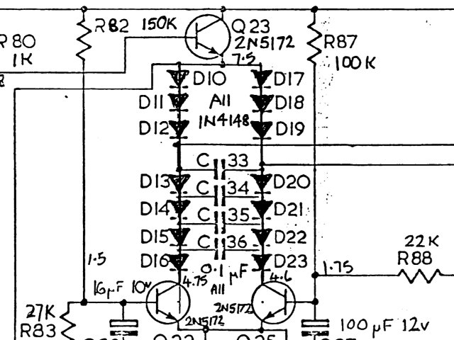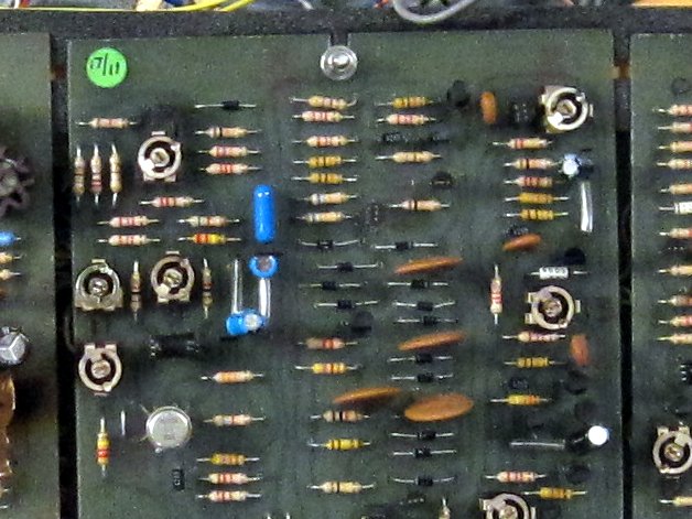 Originally, the filter on this Synthi sounded extremely rough (crunchy might be a better word). This photo shows the circuit board with the filter. The diodes are the small black components, and the capacitors are the 4 brown disc shaped components.