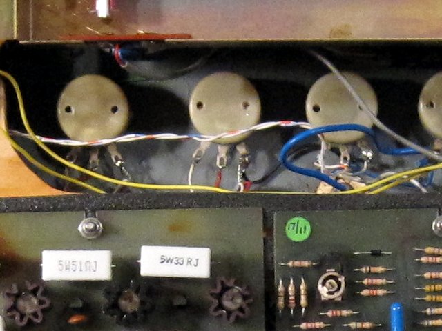 The capacitors, transistors, and power resistors were also upgraded to run cooler. The most obvious changes are the 5 Watt resistors (white ceramic blocks) replacing the green 3 Watt resistors.